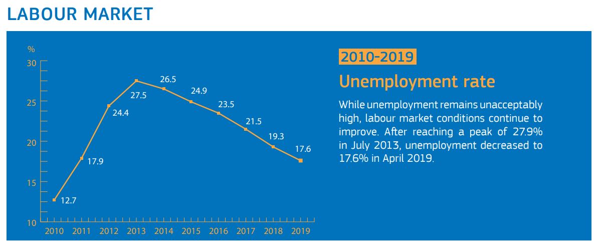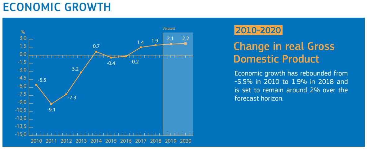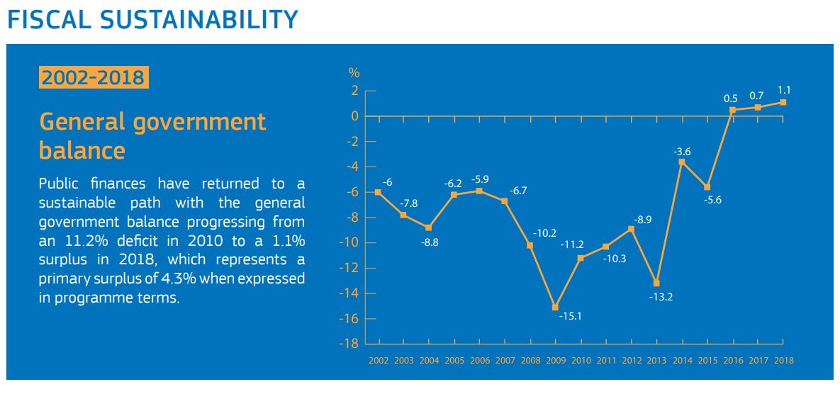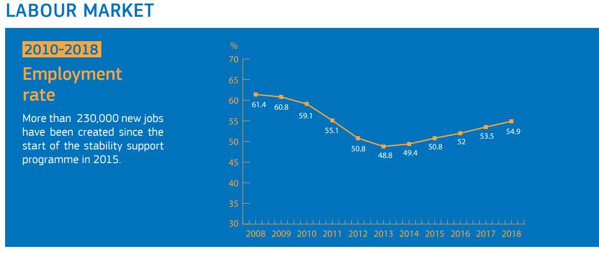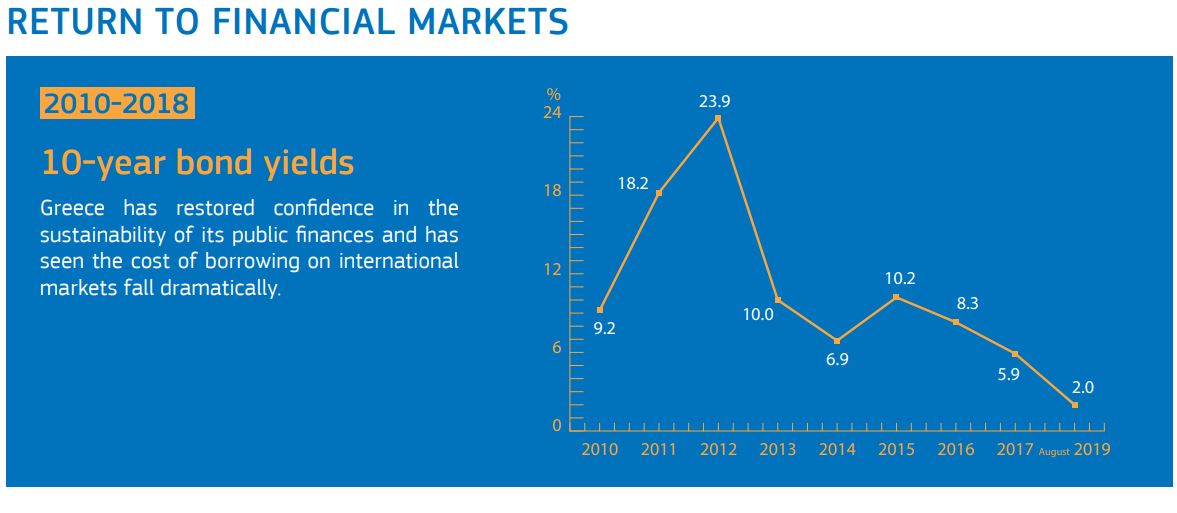 «Συνολικά, οι Ευρωπαίοι εταίροι της Ελλάδας παρείχαν δάνεια ύψους 61,9 δισ. ευρώ με αντάλλαγμα την εφαρμογή από τις ελληνικές Αρχές ενός ολοκληρωμένου πακέτου μεταρρυθμίσεων», συνεχίζει η Κομισιόν. «Όλες μαζί οι μεταρρυθμίσεις αυτές έθεσαν τα θεμέλια για την οικονομική ανάκαμψη, θέτοντας σε εφαρμογή τις θεμελιώδεις προϋποθέσεις που απαιτούνται για τη συνεχή ανάπτυξη, τη δημιουργία θέσεων απασχόλησης και την υγιή δημόσια οικονομία. Οι δείκτες επιβεβαιώνουν ότι, ενώ οι απομένει ακόμη δουλειά, οι προσπάθειες που έχουν αναληφθεί αποφέρουν απτά οφέλη. Για παράδειγμα, το ποσοστό ανεργίας μειώθηκε σε 17,6% τον Απρίλιο του 2019».
