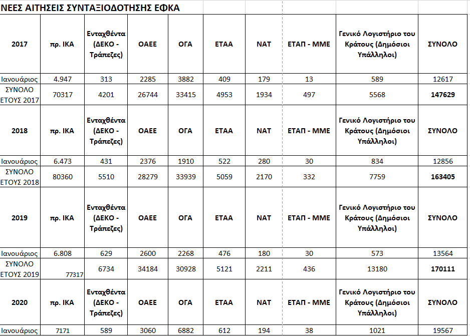 Τον Ιανουάριο του 2020 οι εκκρεμότητες αυξήθηκαν εκ νέου στις 158.156 αιτήσεις συνολικά, ενώ οι ληξιπρόθεσμες αιτήσεις κύριων συντάξεων έφτασαν στις 129.905. Προσωρινή λαμβάνουν πλέον 37.675 άτομα. Αντίστοιχα τον Ιανουάριο του 2019 το σύνολο των εκκρεμοτήτων σε κύριες συντάξεις ήταν 105.846, εκ των οποίων οι 87.221 ληξιπρόθεσμες. Η αύξηση συγκριτικά με τον Ιανουάριο του 2019 φτάνει στο 49%, ενώ συγκριτικά με τον Ιούνιο του 2019, όταν οι εκκρεμείς αιτήσεις ήταν 125.075, η αύξηση είναι 26%. Τον περασμένο Ιανουάριο μπήκαν στο σύστημα 19.567 νέες αιτήσεις και διεκπεραιώθηκαν 13.515 παλαιές. Αυτό σημαίνει πως αυξήθηκε το «στοκ» κατά 6.052 αιτήσεις. Ειδικοί επισημαίνουν πως τους επόμενους μήνες πρέπει να διεκπεραιώνονται 15.000 αιτήσεις το μήνα, ώστε να ισορροπήσει το σύστημα. Αντίστοιχα οι εκκρεμείς επικουρικές συντάξεις κυμαίνονταν κοντά στις 93.000 τον περασμένο Ιανουάριο, έναντι 91.000 τον περασμένο Δεκέμβριο (με απόφαση κύριας ή χωρίς).