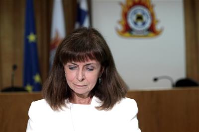 Η Πρόεδρος της Δημοκρατίας Κατερίνα Σακελλαροπούλου κατά την επίσκεψή της στο Ενιαίο Συντονιστικό Κέντρο Επιχειρήσεων του Πυροσβεστικού Σώματος