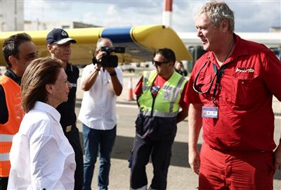 Τα μέλη της Αποστολής και ο πρέσβης την υποδέχθηκαν μπροστά από τα ελικόπτερα SUPER PUMA και CANADAIR και στη συζήτηση που είχαν την ενημέρωσαν για τη συνεισφορά τους στο έργο της κατάσβεσης