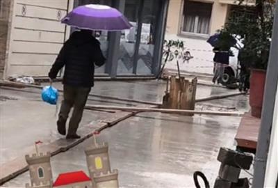 Τα συνεργεία έφτιαξαν έναν στενό διάδρομο με σανίδες, στον οποίο πρέπει να ανέβουν οι περαστικοί για να διασχίσουν τον δρόμο