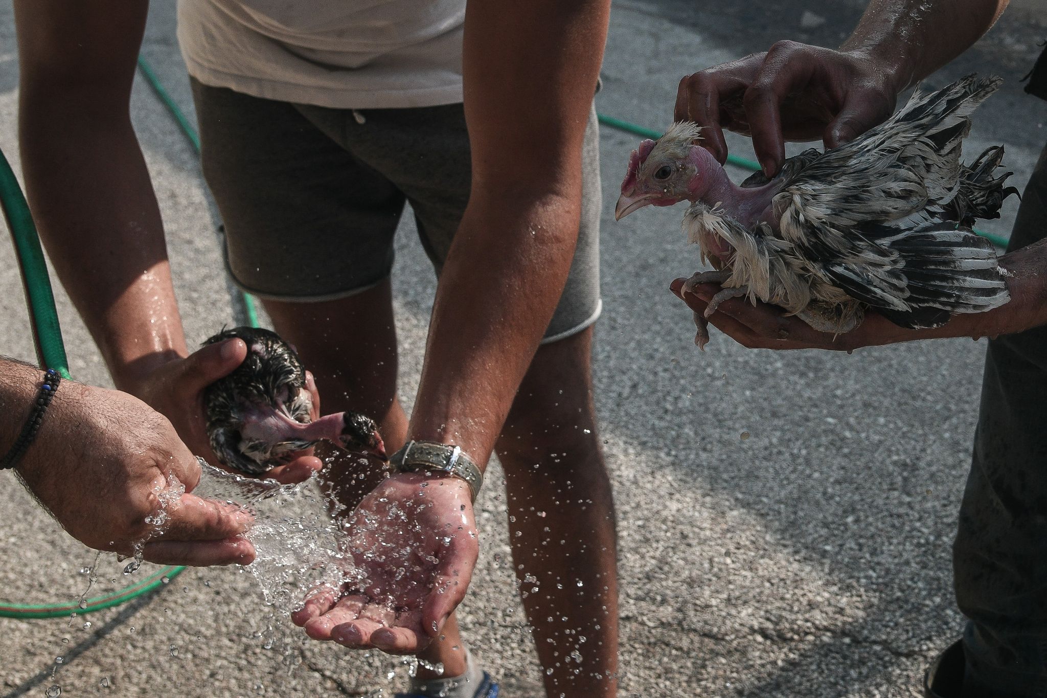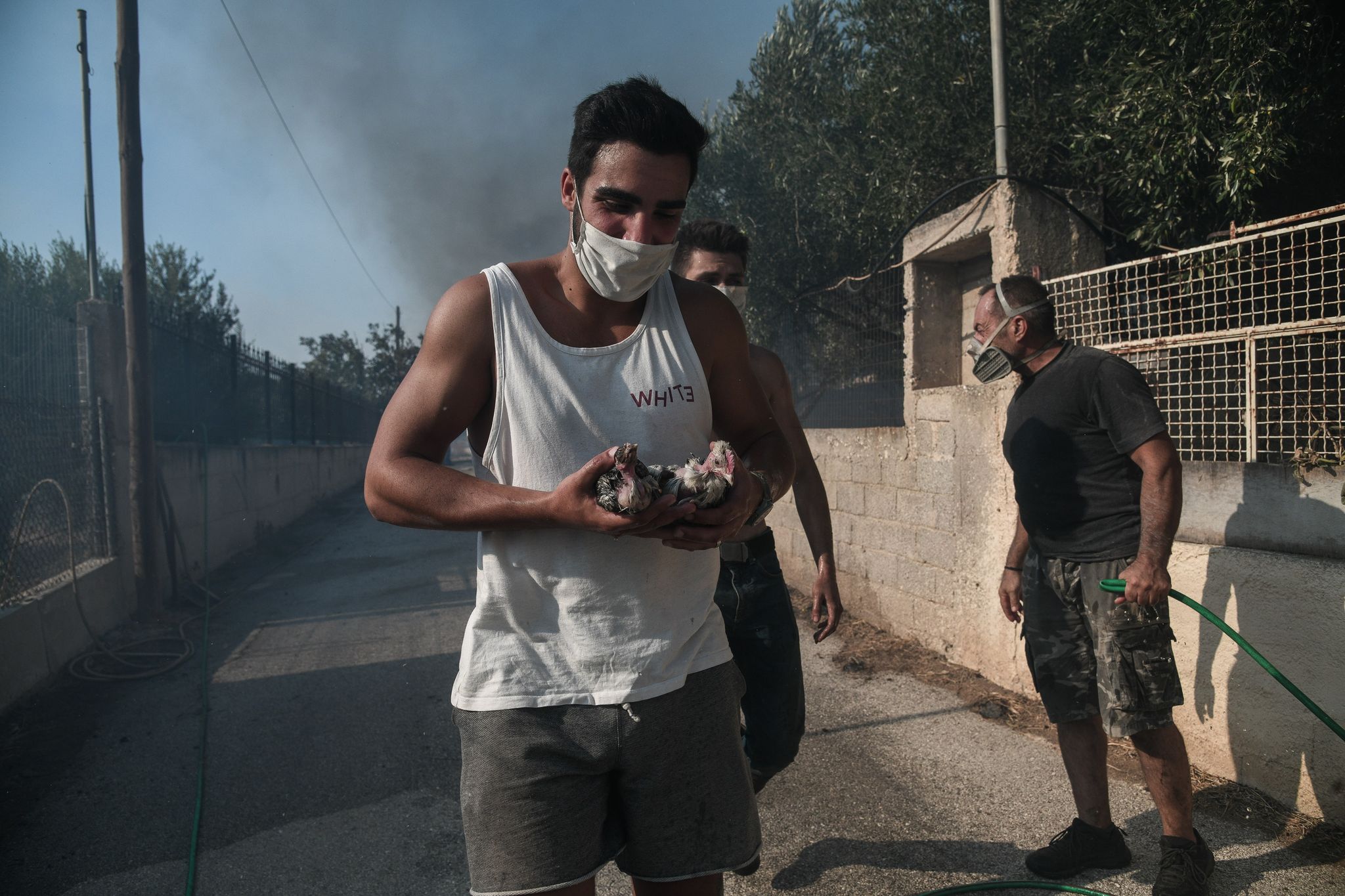 Συγκεκριμένα, ο φακός της Eurokinissi απαθανάτισε κατοίκους της περιοχής την ώρα που σώζουν οικόσιτα πτηνά, ώστε να μην καούν ζωντανά στη φωτιά. Στη συνέχεια, τα βρέχουν με νερό και τους δίνουν να πιουν για να τα ανακουφίσουν.