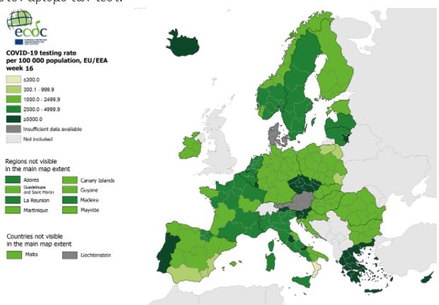Αισιόδοξα είναι τα νέα και από το Ευρωπαϊκο Κέντρο Ελέγχου και Πρόληψης Ασθενειών (ECDC), καθώς όπως φαίνεται από τα στοιχεία η Ελλάδα βρίσκεται στο πράσινο χρώμα όσον αφορά στον δείκτη θετικότητας (κάτω από 4%), ενώ βρίσκεται στις υψηλές θέσεις της Ευρώπης όσον αφορά τα τεστ για την ανίχνευση κορονοϊού (με περισσότερα από 5.000 τεστ ανά 100.000 κατοίκους). Ωστόσο, στον χάρτη ανά 100.000 πολίτες η χώρα μας παραμένει στο κόκκινο.
