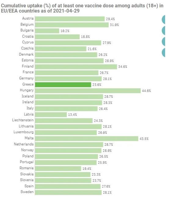 Σύμφωνα με το emvolio.gov.gr, μέχρι και το βράδυ της Μεγάλης Πέμπτης στη χώρα μας έχουν πραγματοποιηθεί 3.075.600 εμβολιασμοί και αναλυτικότερα, 2.131.900 πολίτες έχουν λάβει μόνο την πρώτη δόση του εμβολίου κατά του κορονοϊού, και 943.798 είχαν κάνει και τις δύο δόσεις. Σύμφωνα με το ECDC, η Ελλάδα έχει εμβολιάσει με την πρώτη δόση, το 23,6% του ενήλικου πληθυσμού της.