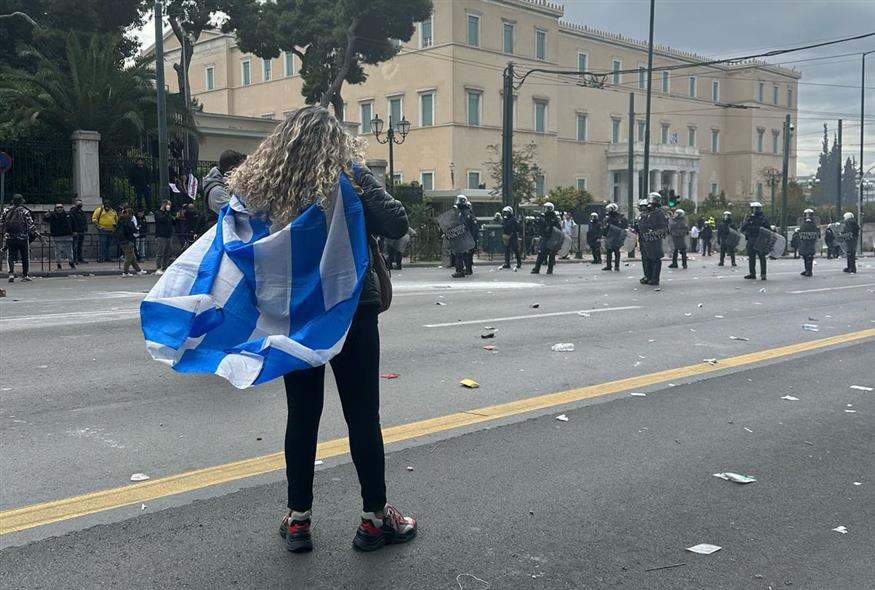 Ομάδα διαδηλωτών στο Σύνταγμα τραγούδησε τον εθνικό ύμνο μπροστά στις δυνάμεις της αστυνομίας.