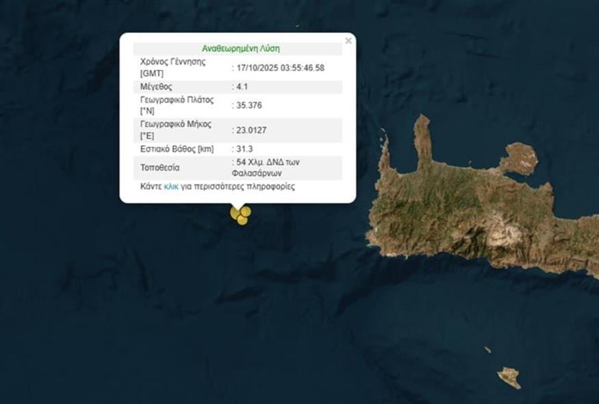 Σεισμική δόνηση 4,1 βαθμών της κλίμακας Ρίχτερ σημειώθηκε στις 06:55, με επίκεντρο τα Φαλάσαρνα Χανίων.
