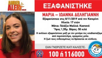 Ανησυχία προκαλεί στο Χαμόγελο του Παιδιού η απουσία πληροφοριών για το πού μπορεί να έχει θεαθεί η Μαρία-Ιωάννα Δεληγιάννη η οποία έχει εξαφανιστεί από τις 8 Νοεμβρίου από την Κατερίνη μαζί με τη 45χρονη μητέρα της.