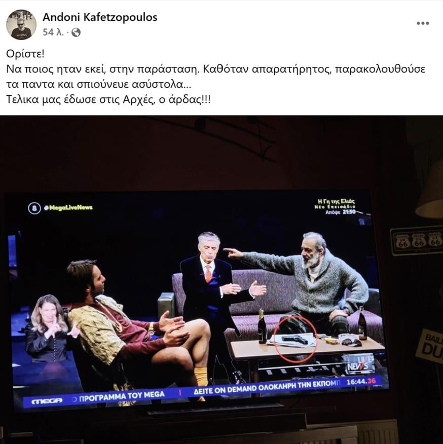 Ακολούθησε και δεύτερη ανάρτηση, στην οποία ο ηθοποιός σχολίασε χιουμοριστικά: «Να ποιος ήταν εκεί, στην παράσταση. Καθόταν απαρατήρητος, παρακολουθούσε τα πάντα και μας σπιούνευε ασύστολα… Τελικά μας έδωσε στις αρχές, ο άρδας!!!»