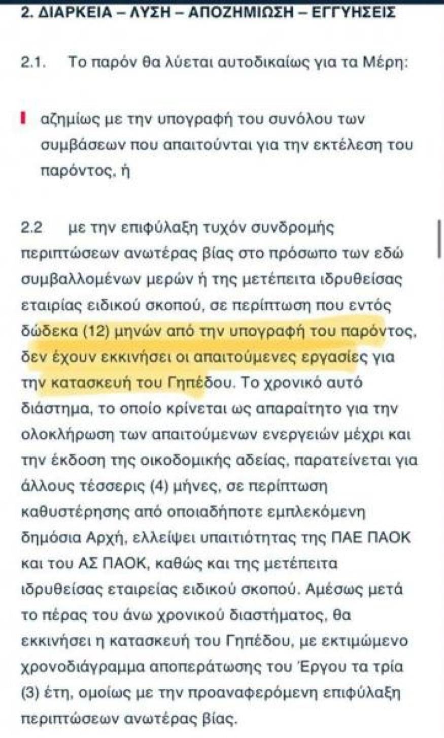 Παράλληλα, απ' τον Ερασιτέχνη έθεσαν εκ νέου το ζήτημα των εγγυήσεων από πλευράς ΠΑΕ, όπως επίσης και την ύπαρξη ενός χρονοδιαγράμματος με καταληκτικές ημερομηνίες. Ωστόσο, απ' την ΠΑΕ ΠΑΟΚ έδωσαν για ακόμα μία φορά ξεκάθαρη απαντηση επί των ζητημάτων που θέτει ο ΑΣ τονίζοντας ότι το μνημόνιο συνεργασίας που έχει καταθέσει η ΠΑΕ στον ΑΣ, προβλέπει στο άρθρο 2.2 ότι οι εγγυήσεις θα δοθούν 12 μήνες από την υπογραφή του παρόντος και ακολούθως, σε τρία χρόνια θα έχει αποπερατωθεί το έργο, όπως με σαφήνεια καταγράφεται στο μνημόνιο, το οποίο απέφυγε να υπογράψει ο ΑΣ...