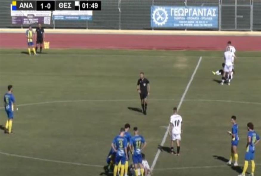 Το παιχνίδι άρχισε κανονικά και μόλις στο 22ο δευτερόλεπτο οι γηπεδούχοι άνοιξαν το σκορ, όμως στη συνέχεια ακολούθησαν σκηνές… πρωτοφανείς: τρεις παίκτες του Θεσπρωτού έπεσαν την ίδια στιγμή στο έδαφος ζητώντας ιατρική βοήθεια και δηλώνοντας αδυναμία να συνεχίσουν.