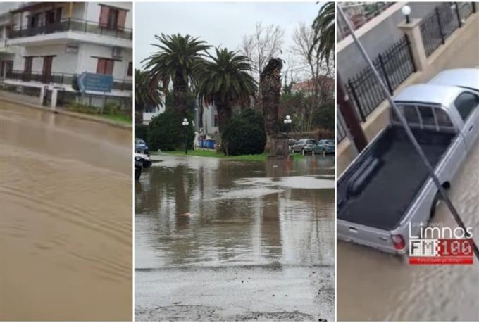 Εισροή υδάτων σε κατοικίες, πλημμυρισμένοι δρόμοι και έκτακτη ανακοίνωση του Δήμου Λήμνου για περιορισμό μετακινήσεων