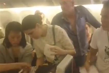 Μέσα από το αεροσκάφος φαίνονται οι επιβάτες να προσπαθούν να δροσιστούν με πρόχειρο τρόπο