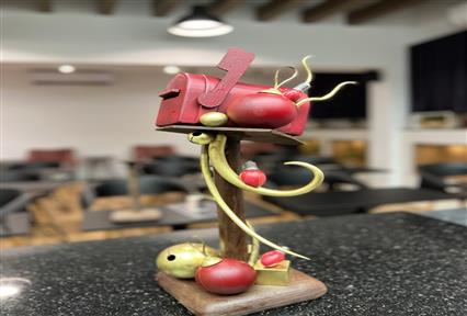 Ο Θεσσαλονικιός ζαχαροπλάστης Γιώργος Αυγέρος, βραβευμένος σε βαλκανικούς διαγωνισμούς στη γλυπτική σοκολάτας, έφτιαξε υπέροχες σοκολατένιες δημιουργίες που κοσμούν τη βιτρίνα