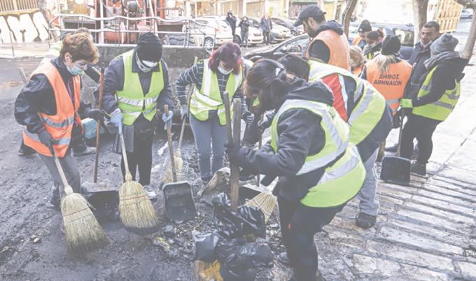 Βομβαρδισμένα τοπία, δρόμοι και κτίρια σε Αθήνα και Θεσσαλονίκη, με τα συνεργεία να εργάζονται εντατικά για τον καθαρισμό τους