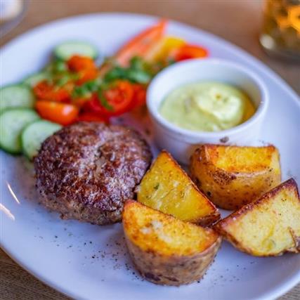 Συνταγή για λαχταριστά μπιφτεκάκια στο ταψί με καλοψημένες, λεμονάτες πατάτες και ένα ντιπ που υπόσχεται απολαυστικές βουτιές στη γεύση.