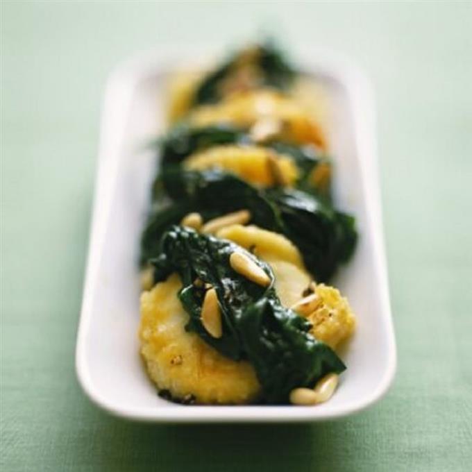 Όλοι αγαπούν τις κροκέτες πατάτας, πόσο μάλλον εκείνες που έχουν ενισχυθεί γευστικά με πικάντικο τυρί και συνοδεύονται από σπανάκι σοταρισμένο στο βούτυρο.