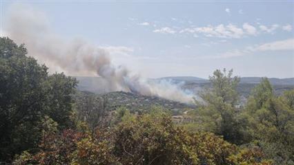 Η πυρκαγιά καίει δασική έκταση, κυρίως πουρνάρια, και εκδηλώθηκε υπό αδιευκρίνιστες μέχρι στιγμής συνθήκες