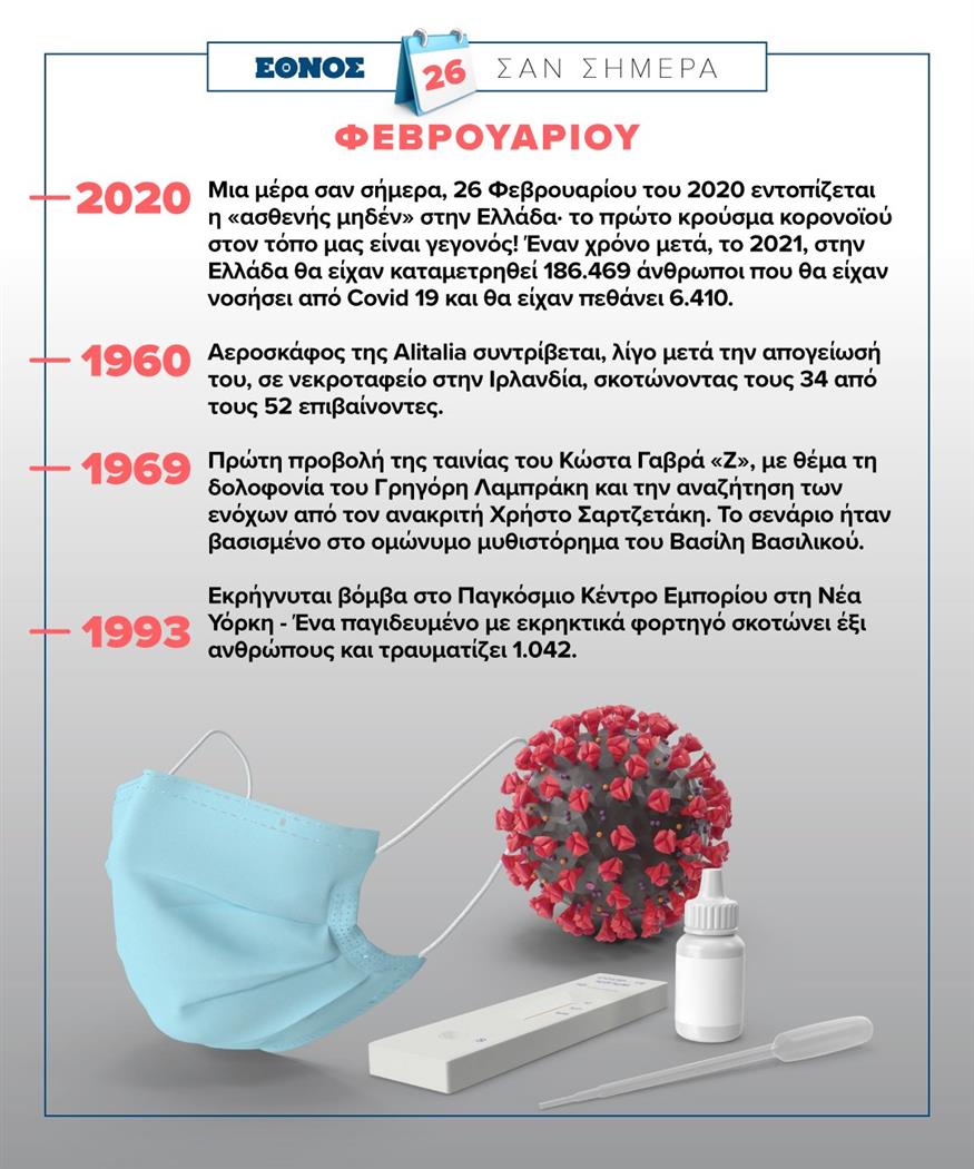 Μια μέρα σαν σήμερα, 26 Φεβρουαρίου του 2020 εντοπίζεται η «ασθενής μηδέν» στην Ελλάδα· το πρώτο κρούσμα κορονοϊού στον τόπο μας είναι γεγονός! Έναν χρόνο μετά, το 2021, στην Ελλάδα θα είχαν καταμετρηθεί 186.469 άνθρωποι που θα είχαν νοσήσει από Covid 19 και θα είχαν πεθάνει 6.410.