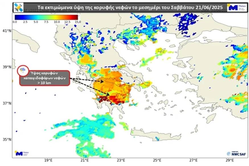 Οι ισχυρές καταιγίδες αποτυπώθηκαν σε γράφημα από τον Ευρωπαϊκό Μετεωρολογικό Δορυφόρο Meteosat – 10, που σύμφωνα με τα όσα αναφέρει το Εθνικό Αστεροσκοπείο Αθηνών/Meteo.gr υπολογίστηκε ότι τα ύψη των καταιγιδοφόρων νεφών ξεπέρασαν τα 10km.