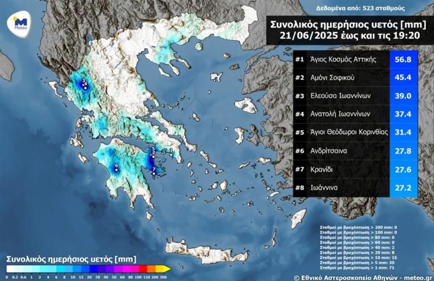 Στις χρωματικές διαφορές του χάρτη, φαίνεται που έπεσαν σημαντικά ύψη βροχής, με τα κεντρικά και τα νότια να δέχονται μεγάλο όγκο νερού. Μάλιστα, το μεγαλύτερο ύψος καταγράφηκε στον Άγιο Κοσμά Αττικής με περίπου 57mm, τα οποία έπεσαν σε διάστημα μιας ώρας, ενώ αξίζει να επισημανθεί ότι 1mm νερού αντιστοιχεί σε 1 λίτρο νερού σε επιφάνεια 1 m2.